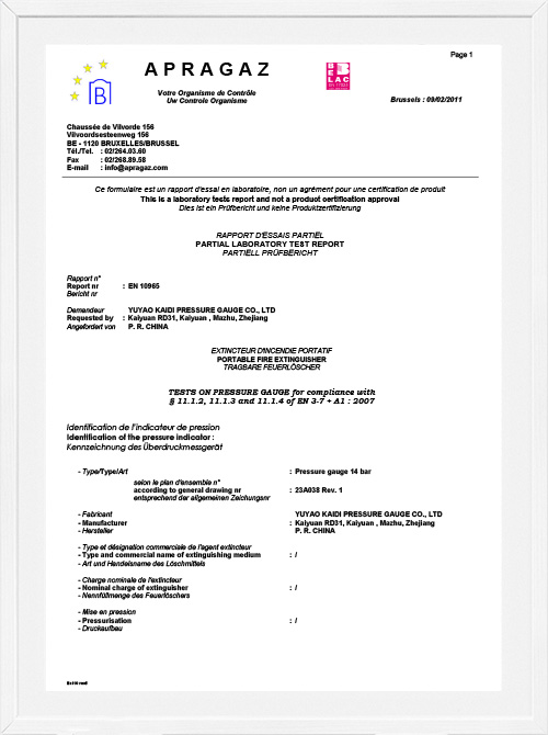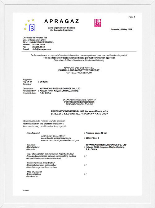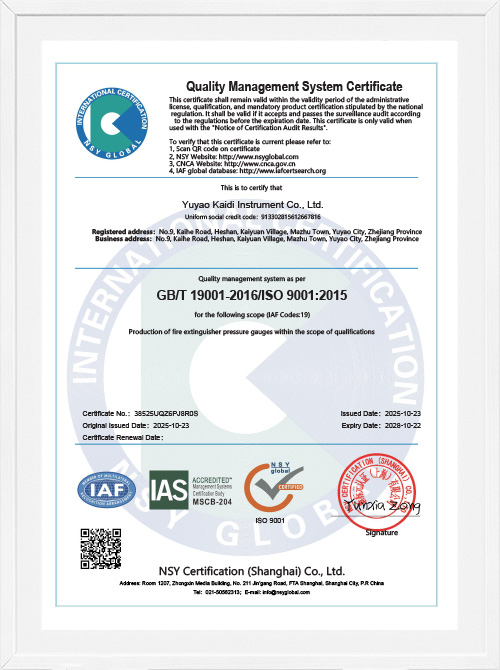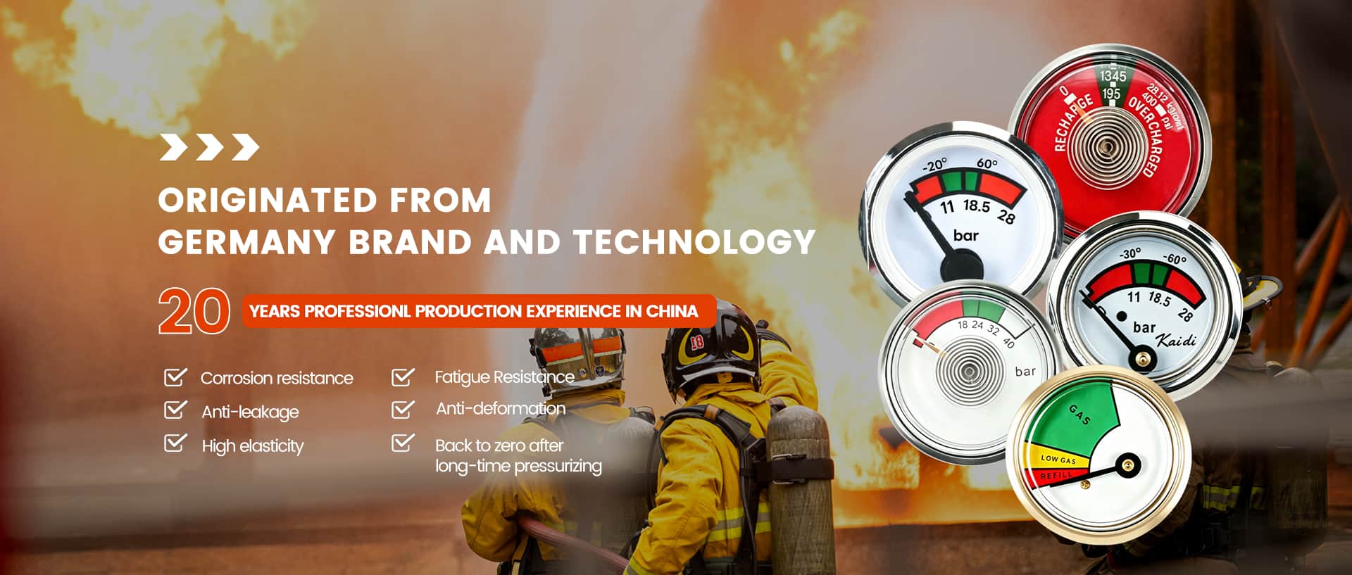 , located in yuyao,with convenient traffic, nearing Ningbo port and Hangzhou.has been dedicating in producing and researching the pressure gauges for fire extinguishers. Our products get EN3-7 approval and established Quality management system ISO9001- 2015.Now we have more than 100 staffs, including 10 specialized engineers and we sets of digital control machines and automatic production lines.KAIDI provide the excellent products, better price and better service to the customers.our product including Fire extinguisher manometer, diaphragm pressure gauge,spring pressure gauge,we have the annual capacity of 20 millions pressure gauge of fire extinguishers...